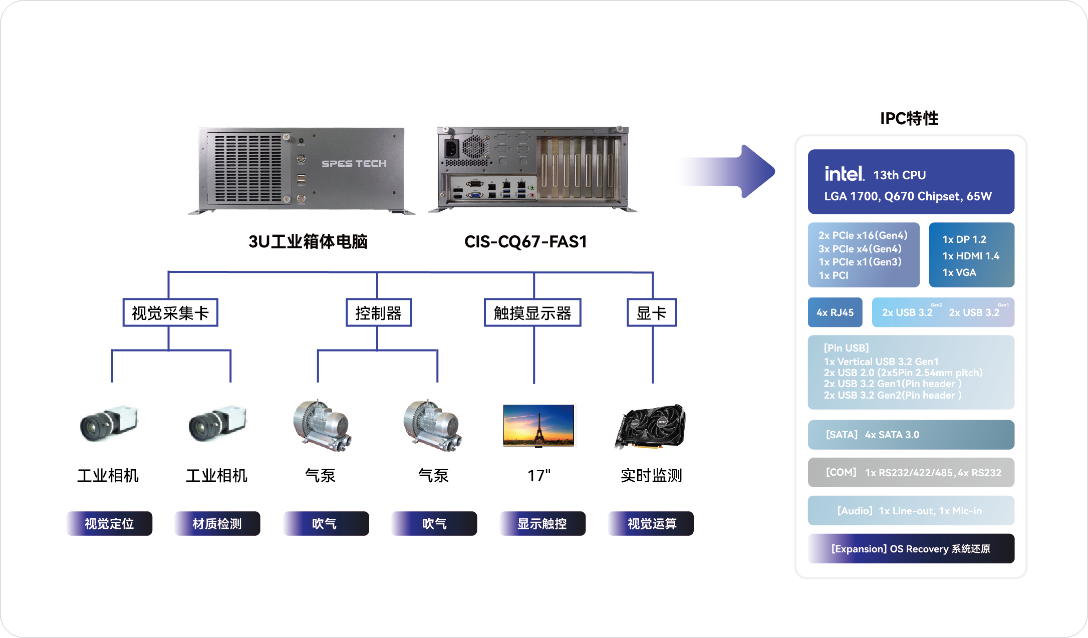 2.为实现外接视觉采集卡、工业检测相机、显示器等多功能模块,实现精准快速检测,需要具备极强扩展性;